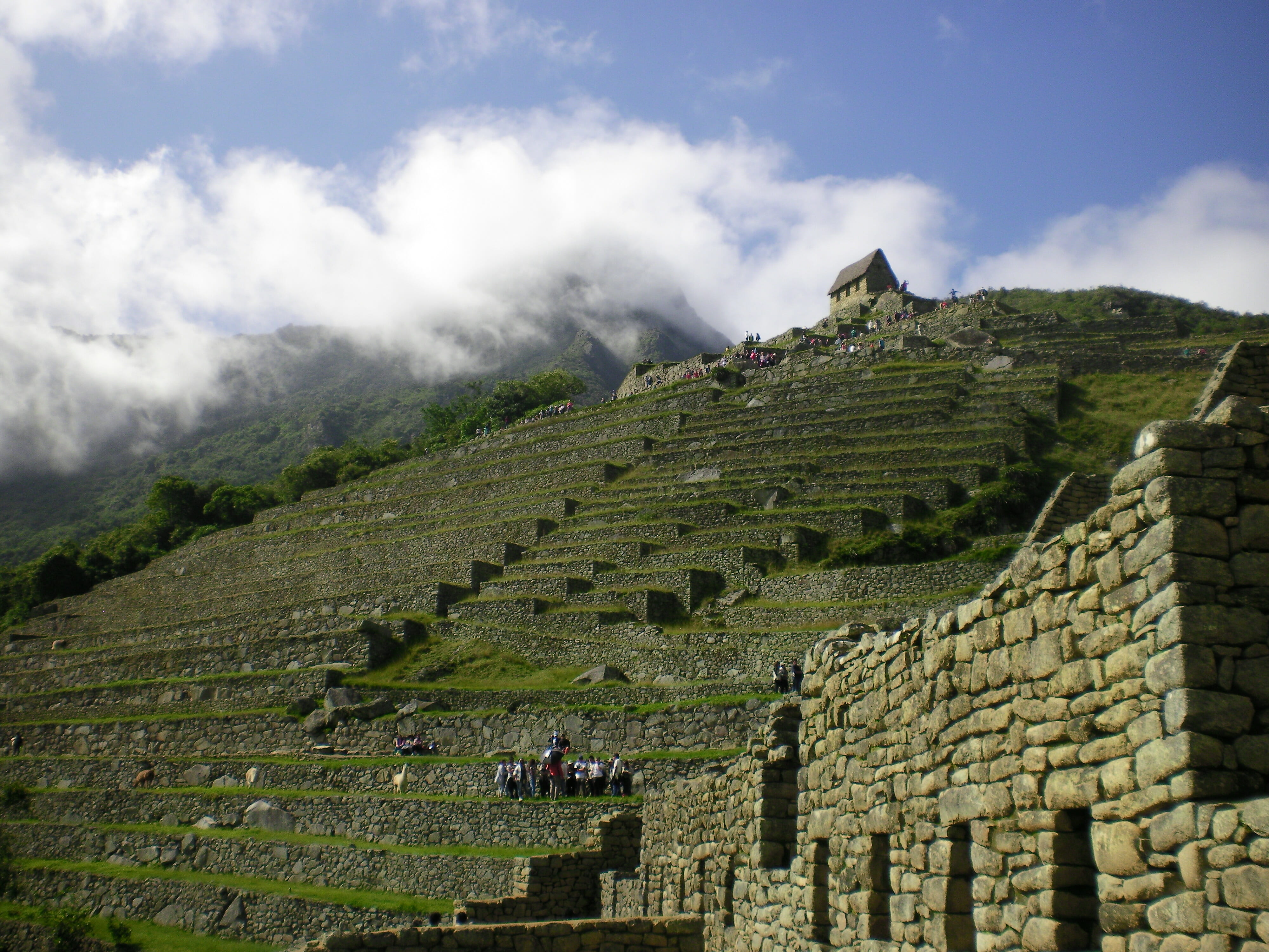 La visite au Macchu Picchu coûte très cher (autour de 200 euros par personne), elle comprend le train depuis Cuzco, l’hebergement et la visite du site avec un guide. Malgré ce prix, nous ne regrettons absolument pas la visite qui, bien que très touristique, nous a laissé sans voix. Le train déjà est génial car il est à toit vitré panoramique, il nous permet donc d’admirer les montagnes tout au long du trajet. On arrive à Aqua Calientes, la ville au pied du Macchu Picchu. La ville en elle-même n’offre rien en particulier si ce n’est ces eaux chaudes qui sont plutôt sympathiques. Le lendemain nous partons faire la visite du site. On peut accéder à l’entrée du site en bus (30 min environ depuis Aqua Calientes) ou à pied (2/3h de montée). Nous choisissons le bus car je suis toujours malade et je souhaite garder toute mon énergie pour la visite du célèbre site. L’arrivée est très étrange car nous ne voyons rien, le site est recouvert de nuages (il est alors 6h du matin), mais une heure plus tard, au milieu des ruines, le ciel se dégage pour nous faire découvrir l’incroyable site. A 8h on retrouve notre guide qui parle pas moins de 4 langues (Français, espagnol, anglais et allemand) et pendant une heure on parcourt le site avec lui en écoutant l’histoire de la création de la cité inca. Après cela nous gravissons le Wayna Picchu (Picchu signifie montagne en Queshua) qui nous permet d’admirer une dernière fois le site du Macchu Picchu avant de reprendre le train vers Cuzco.